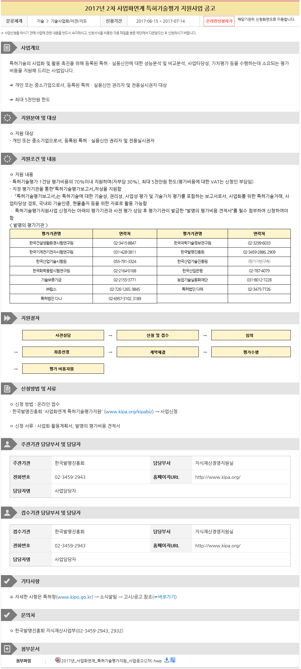 Á¦¸ñ 2017³â 2Â÷ »ç¾÷È­¿¬°è ƯÇã±â¼úÆò°¡ Áö¿ø»ç¾÷ °ø°í
