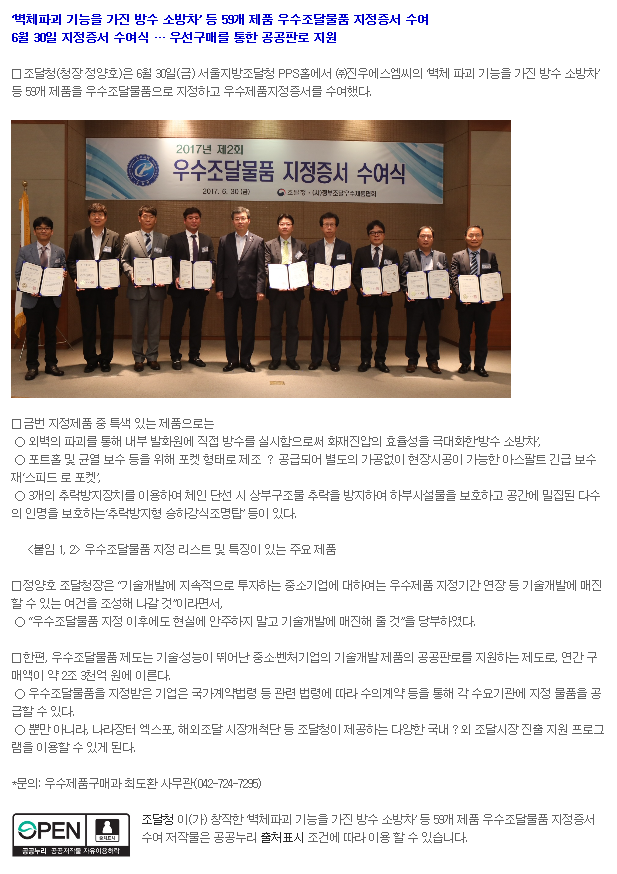 Á¦¸ñ ¡®º®Ã¼ÆÄ±« ±â´ÉÀ» °¡Áø ¹æ¼ö ¼Ò¹æÂ÷¡¯ µî 59°³ Á¦Ç° ¿ì¼öÁ¶´Þ¹°Ç° ÁöÁ¤Áõ¼­ ¼ö¿©